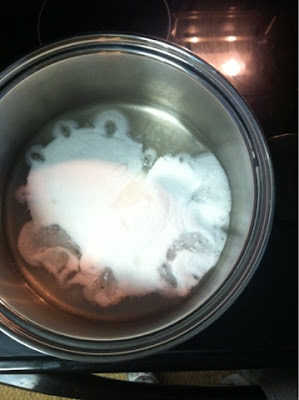 We start with 8 oz. of corn syrup, 1 cup of sugar, and an ENTIRE jar of peanut butter. I am not typically enthusiastic about using an entire jar of peanut butter in one recipe, but I just picked up 5 jars at Harris Teeter for 60 cents two weeks ago, and another 5 jars last week for 32 cents. I had a few to spare.